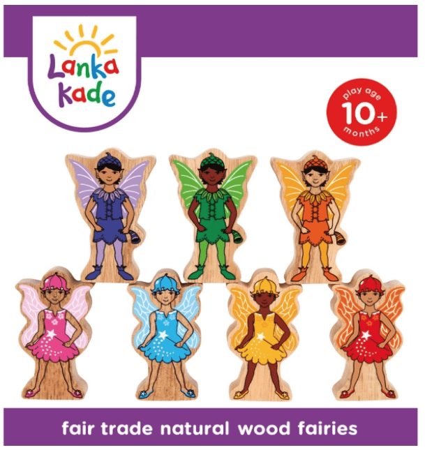 Children will love playing, sorting and stacking with this colourful wooden toy rainbow fairy playset. Every fairy has a colourful double sided design with a beautiful wood grain edge.Pair these wooden fairy toy figures with our rainbow egg playset for magical colour matching games or pair with our mythical characters for spooky seasonal play. This rainbow fairy playset: is printed on both sides with a colourful showing a natural wood grain edge includes a red, yellow, orange, green, blue, purple and pink fairy is a super chunky size – each piece is 25mm thick is made from sustainable FSC rubber wood is perfect for small world play, story sacks and more is supplied in a branded box – perfect for wrapping up as a gift! Don’t miss our extensive range of characters and playsets in our colourful natural wood range – suitable from 10 months plus! Handcrafted by skilled artisans in Sri Lanka from sustainably sourced rubber wood and non toxic paints. Blemishes should be expected, these are part of the beauty of a natural wood product. Look at the ‘I Inspire’ below for the potential play and educational value of this product.