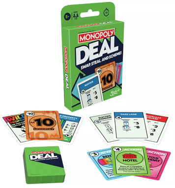 Swap, steal and scheme with the Monopoly Deal card game! Be the first player to collect three complete Property card sets, each in a different colour, to win. This deck includes 110 cards: Property cards, Wild Property cards, Action cards and Money cards. Wild Property cards help players build Property sets. Action cards mix up the game by letting players collect rent, steal and swap properties, and more.