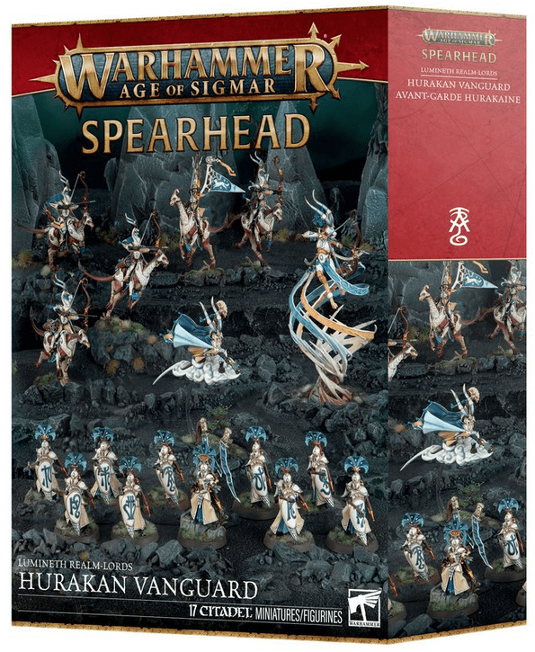 On the wind they ride! This box is an ideal way to start a new Lumineth Realm-lords collection – or expand an existing army – and save money compared to buying the kits individually. This elite force is led by a Hurakan Windmage – a powerful spellcaster riding a bank of sentient cloud – and defended by a unit of Vanari Auralan Wardens wielding spears and shields. A unit of Hurakan Windchargers adds the speed you’ll need to take and hold distant objectives. Supporting the force with volleys from its Bow of the Wind’s Vengeance is a mighty Hurakan Spirit of the Wind. These miniatures comprise a complete Spearhead force, meaning you’re ready to jump into tight, tactical games and cleanse the Mortal Realms.