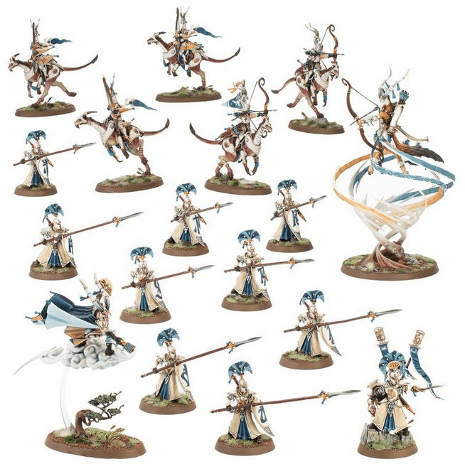 Buoyed aloft by the vigour of the wind, the Hurakan Vanguard protect the borders of Lumineth territory with the swiftness of a speeding zephyr. Through their bond with the air, these devoted warriors of Hysh fight within the heart of a hurricane. Its powerful currents carry the aelves and lend their arrows greater strength, while enemies caught within the swirling tumult are completely outmanoeuvred and picked apart.