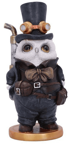Ready for adventure this owl stands proud and wide eyed, dressed in a top hat with gold goggles, a leather waistcoat, drooped bow tie and leather belts with compartments to store equipment. On his back his back he carries his apparatus which is covered in gears and rivets. Cast in the finest resin before being expertly hand-painted, this Owl would make the perfect addition to any Steampunk collection.