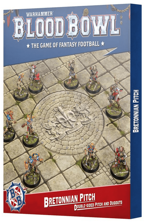 This set contains a double-sided, fold-out card Blood Bowl pitch, depicting the home stadium of a Bretonnian team. One side features the castle courtyard in all its pre-game splendour, while the other shows the pitch in tatters as disgruntled locals bombard it with large rocks.