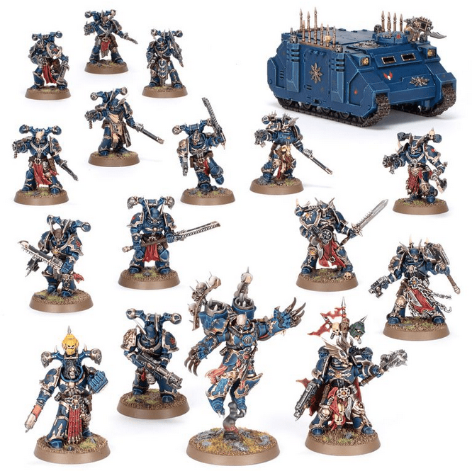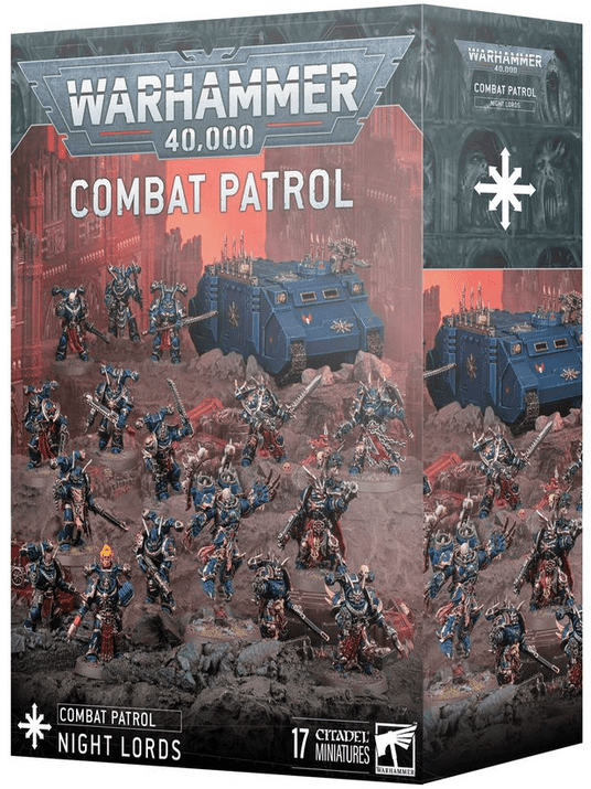 This packed box is the perfect way to start a new Night Lords-themed Chaos Space Marines collection – or expand an existing army – and save money compared to buying the kits individually. This army is led from the front by a Chaos Lord with Jump Pack, a melee powerhouse eager to get stuck in. The core of the force is composed of Legionaries, versatile line troops just as capable of taking vital objectives as unleashing devastating firepower. A unit of Chosen brings thousands of years of experience to the fight, along with powerful melee weapons. The Chaos Rhino will get one of your units where they need to go in relative safety, making this force surprisingly mobile. These 17 multipart plastic miniatures represent a complete Chaos Space Marines force for use in tight, tactical Combat Patrol games of Warhammer 40,000. The rules for this Combat Patrol are available as a free download on the Warhammer Community website. This boxed set is only available while stocks last.