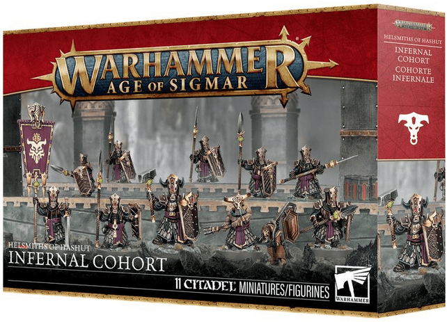 This multipart plastic kit builds 10 Infernal Cohort warriors, and their gong carrying Hobgrot – durable and strong infantry for your Helsmiths of Hashut armies in games of Warhammer Age of Sigmar. They can be armed with your choice of infantry-chopping Hashutite blades or more defensive Hashutite spears. These hardy troops are ideal for holding objectives or trudging through enemy fire.