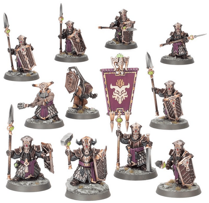The kit includes parts to build an optional champion with a choice of two heads, armed with either a two-handed axe or a hammer and shield. The optional standard bearer has three head options and three banner toppers. The optional musician is accompanied by a Hobgrot who has a choice of two heads. The shields and left arms are interchangeable across the miniatures, making it easy to customise your disciplined and ruthless warriors.