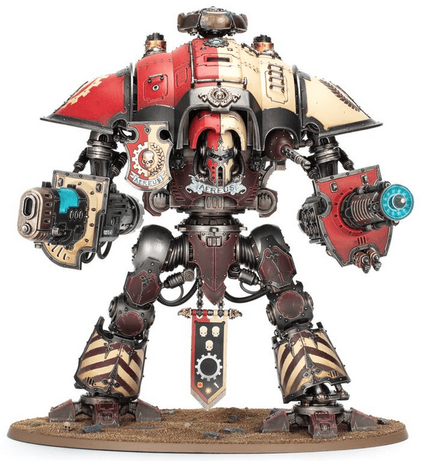 – Knight Warden, armed with avenger gatling cannon, heavy flamer, meltagun (which can be replaced with a Questoris heavy stubber), and reaper chainsword (which can be replaced with a thunderstrike gauntlet)