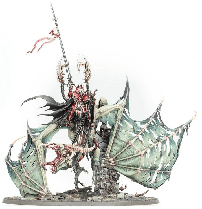Prince Vhordrai is the most feared vampire cavalier in existence – the legendary castellan, and prisoner, of the Crimson Keep. When released from his cursed fortress to wage war against the living, Vhordrai rides forth atop the undead Draconith known as Shordemaire. This ancient beast spews gouts of pestilential breath that melt flesh and armour, before swooping in low so that its master can drive his Bloodlance through the ribs of any foes still standing.