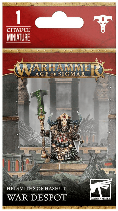 This multipart plastic kit builds a War Despot, a warrior noble for your Helsmiths of Hashut armies in games of Warhammer Age of Sigmar. They are armed with a Daemonflame Glaive – a brutal weapon powered by a trapped daemon – and wear ornate armour covered in runes and gems. These cruel overlords make ideal leaders for Hashutite troops, inspiring nearby warriors to fight harder while also getting stuck in themselves.