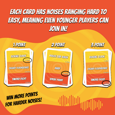 - FUN FOR EVERYONE: Guess That Noise is the perfect party game for family and friends between 2 – 15 players. Each card has noises ranging from hard to easy, meaning even younger players can join in!